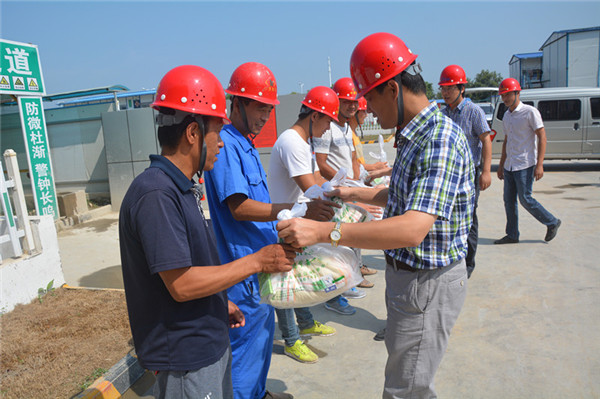 8月14日上午,開發(fā)公司副總裁劉建華帶隊(duì)來(lái)到園區(qū)派出所、夢(mèng)家園、許莊變、2014年市政二標(biāo)、生產(chǎn)力中心等項(xiàng)目工地,現(xiàn)場(chǎng)慰問奮戰(zhàn)在高溫一線的企業(yè)員工和建筑工人,并親自給他們遞上了毛巾、肥皂、洗發(fā)水、清涼油等防暑降溫物品。