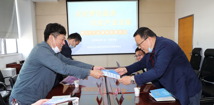 4月27日上午,正值第29個(gè)稅收宣傳月之際,宿遷經(jīng)濟(jì)開發(fā)區(qū)稅務(wù)局張森局長(zhǎng)帶隊(duì)來園區(qū)開發(fā)公司宣傳調(diào)研。