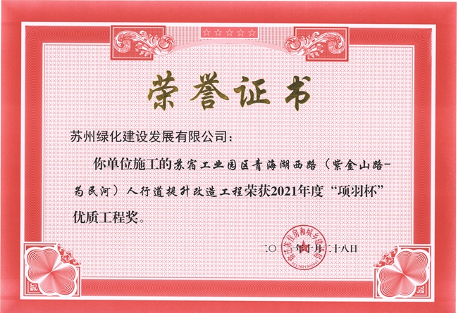 園區(qū)青海湖西路人行道提升改造工程喜獲2021年度宿遷市“項(xiàng)羽杯”優(yōu)質(zhì)工程獎