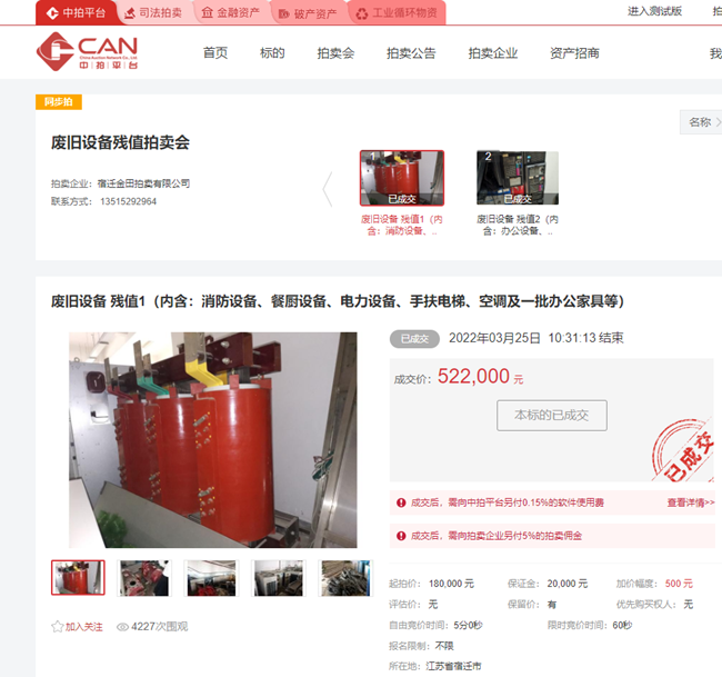3月25日上午10時(shí),城發(fā)公司一批廢舊消防設(shè)備、餐廚設(shè)備、電力設(shè)備、手扶電梯、空調(diào)等物資在中拍平臺(tái)公開(kāi)拍賣(mài),經(jīng)過(guò)30分鐘的緊張激烈競(jìng)價(jià),最終以522000元成交標(biāo)的,比評(píng)估價(jià)180000元高出342000元,溢價(jià)率190%。