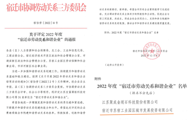 近日,園區(qū)城發(fā)公司獲評(píng)2022年度“宿遷市勞動(dòng)關(guān)系和諧企業(yè)” 榮譽(yù)稱(chēng)號(hào)。