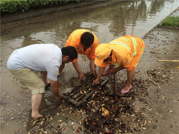市政搶險(xiǎn)疏通小組迅速調(diào)集人員及物資力量,開展區(qū)內(nèi)泄洪及排水工作。公舍等項(xiàng)目為迅速排澇,員工在水中冒雨架好水泵,安裝吸水管,鋪設(shè)排水水帶,發(fā)動(dòng)機(jī)器快速排水,使公舍車庫等水位快速下降。